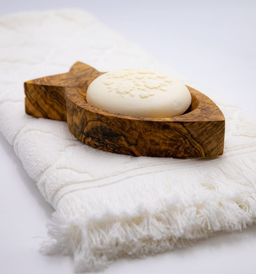 Seifenschale aus Olivenholz mit Fischmotiv